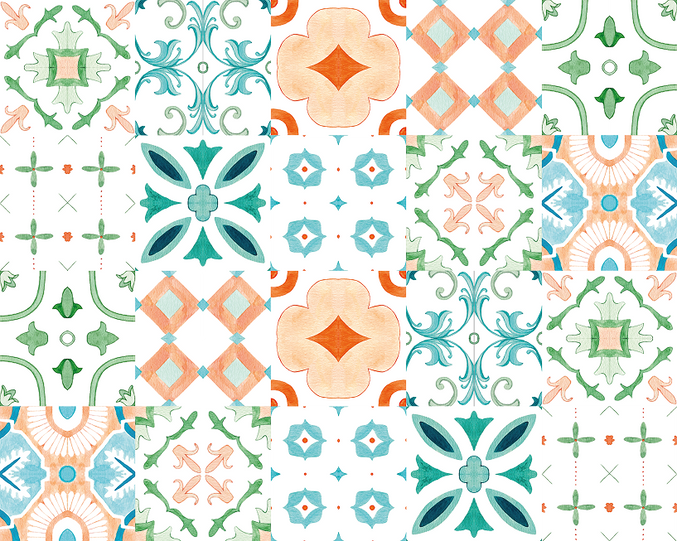 This hand-painted pattern was created using watercolour techniques and later digitized to form a seamless pattern. Inspired by the Mediterranean lifestyle, the design draws from traditional ceramic tiles, coastal architecture, and sun-soaked colour palettes found across the region.
