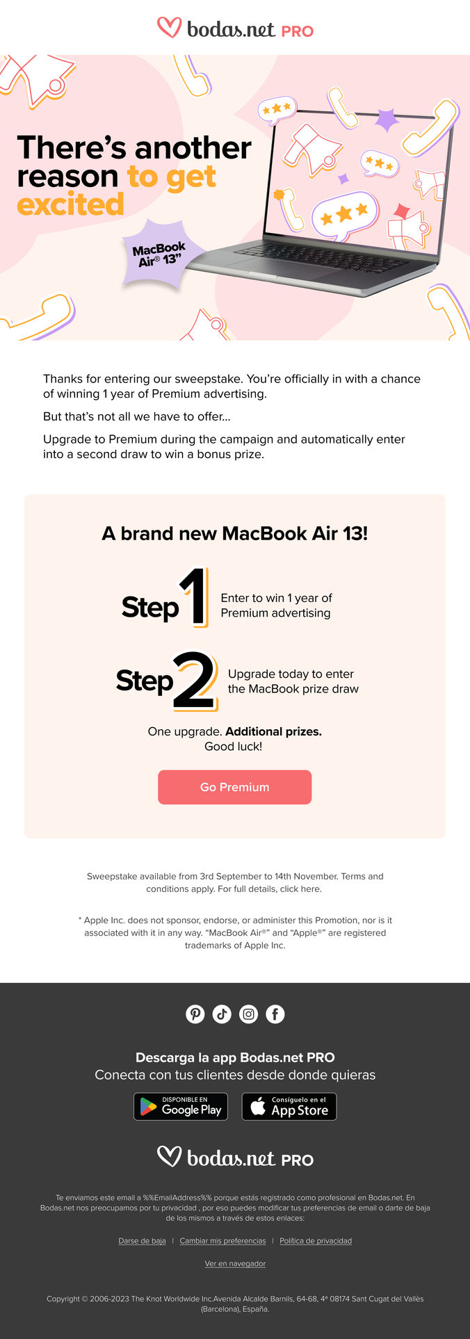 In 2024, I designed the biannual Premium Giveaway (Sweepstakes) campaign for all WeddingWire / Bodas.net markets, promoting the opportunity for wedding professionals to win one free year of Premium membership. The campaign was conceived to drive lead generation, increase product awareness, and boost engagement across our vendor community.